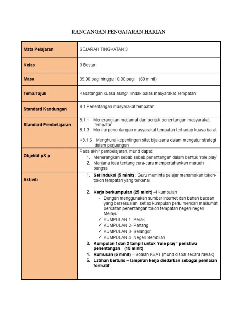 Cadangan rancangan pengajaran harian bab 1 sejarah tingkatan 2 tingkatan : rph sejarah tingkatan 1. Rph format power point boleh diedit.… see more.